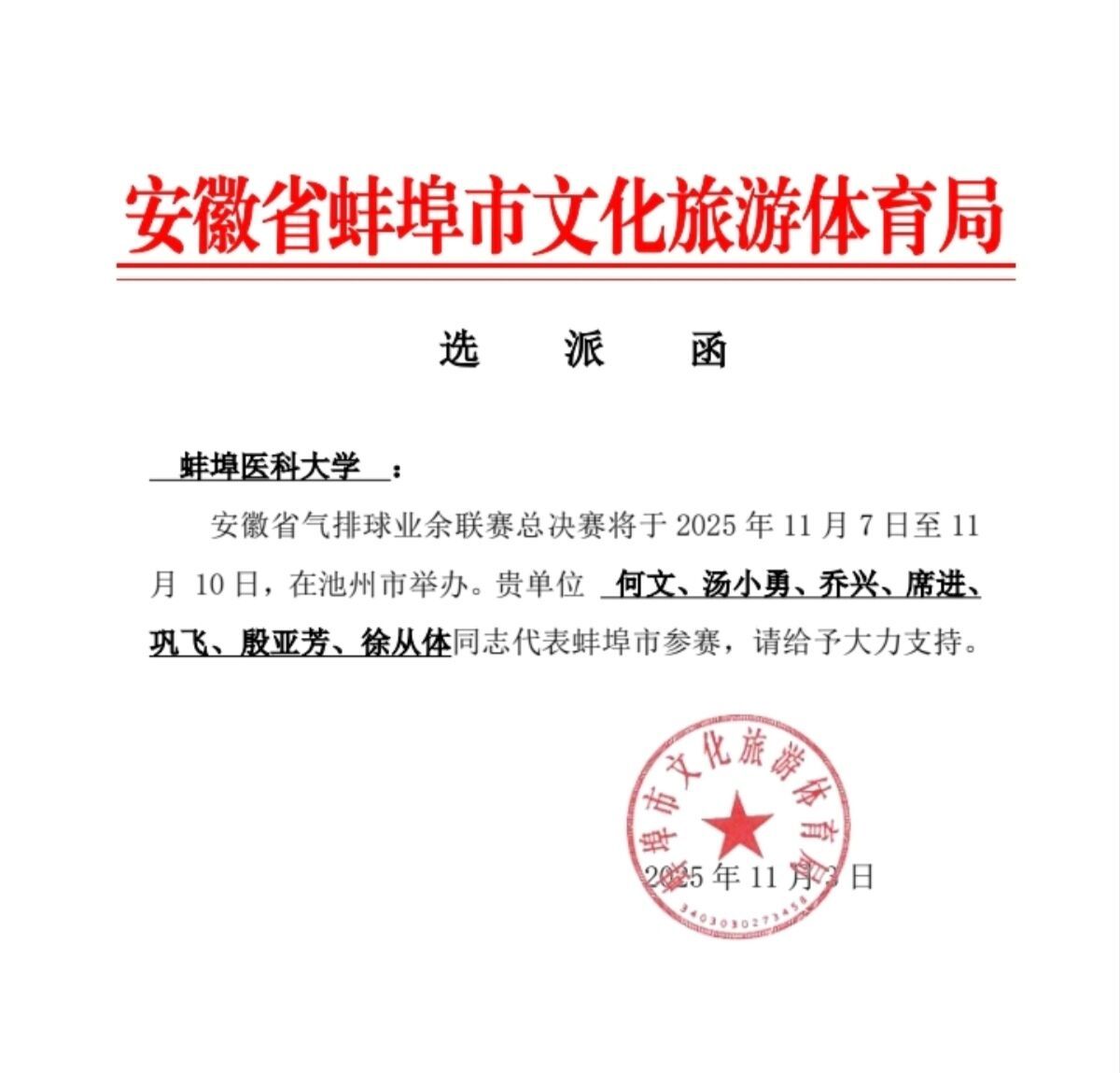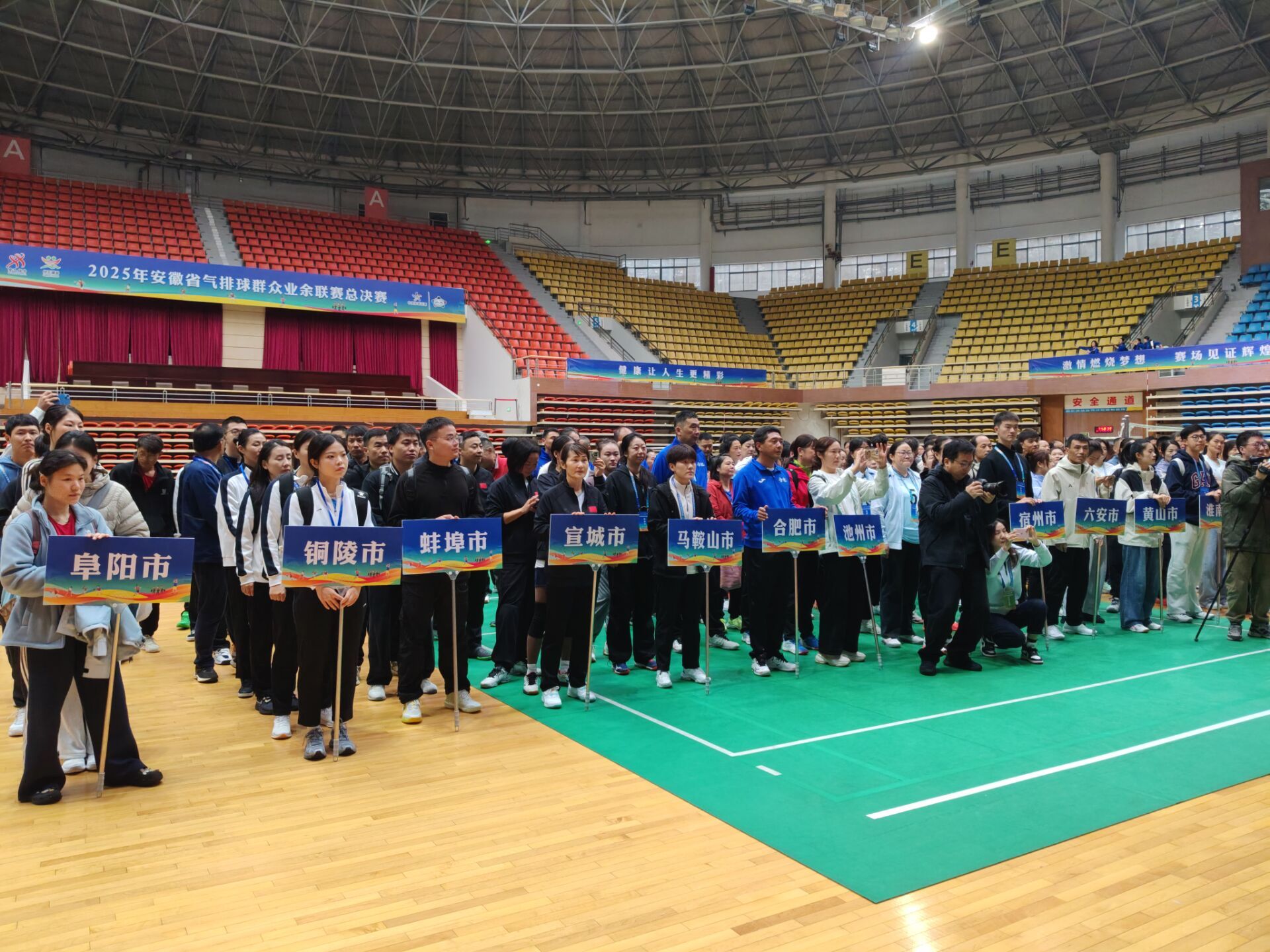 11月7-10日,2025年安徽省气排球群众业余联赛总决赛在池州市隆重开赛,我校职工气排球协会巩飞等七名职工被抽调加入蚌埠市气排球代表队,与全市精英选手并肩作战,在赛场上展现蚌医人的奋进风采与体育精神。此次总决赛由安徽省体育局主办,系我省群众气排球运动最高赛事,全省16个地市的近600名选手参加比赛,其中,由我校6名职工参与的蚌埠市男子中年组代表队荣获全省第八名的优异成绩。