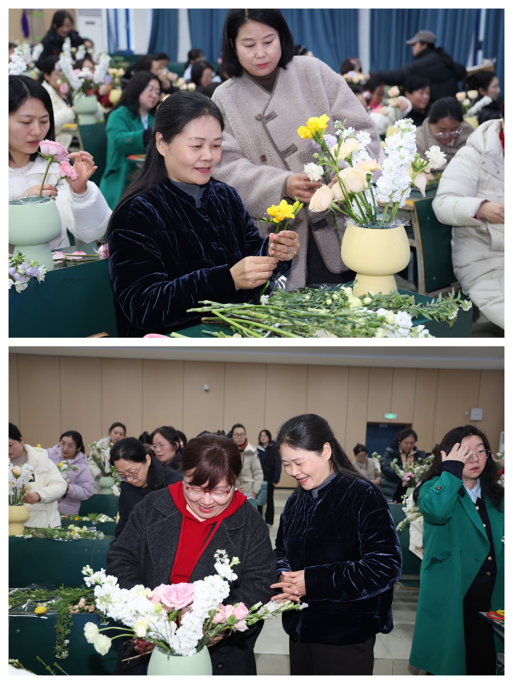 3月5日下午,“把春天带回家”艺术插花活动温馨启幕,67位来自各学院、部门的女教职工齐聚一堂,郑兰荣也参与其中,与女同胞们共赴花艺之约。活动现场花香萦绕,专业花艺老师细致讲解花材选择、色彩搭配、修剪造型等插花技巧,女教职工们认真聆听、踊跃互动,充分发挥创意巧思,打造出一件件精美的花艺作品。郑兰荣与大家一同创作,分享心得并鼓励女教职工劳逸结合,在工作之余感受生活美学,以饱满热情为学校发展贡献巾帼力量。女教职工们在艺术创作中放松身心,提升审美素养,更拉近了彼此距离。