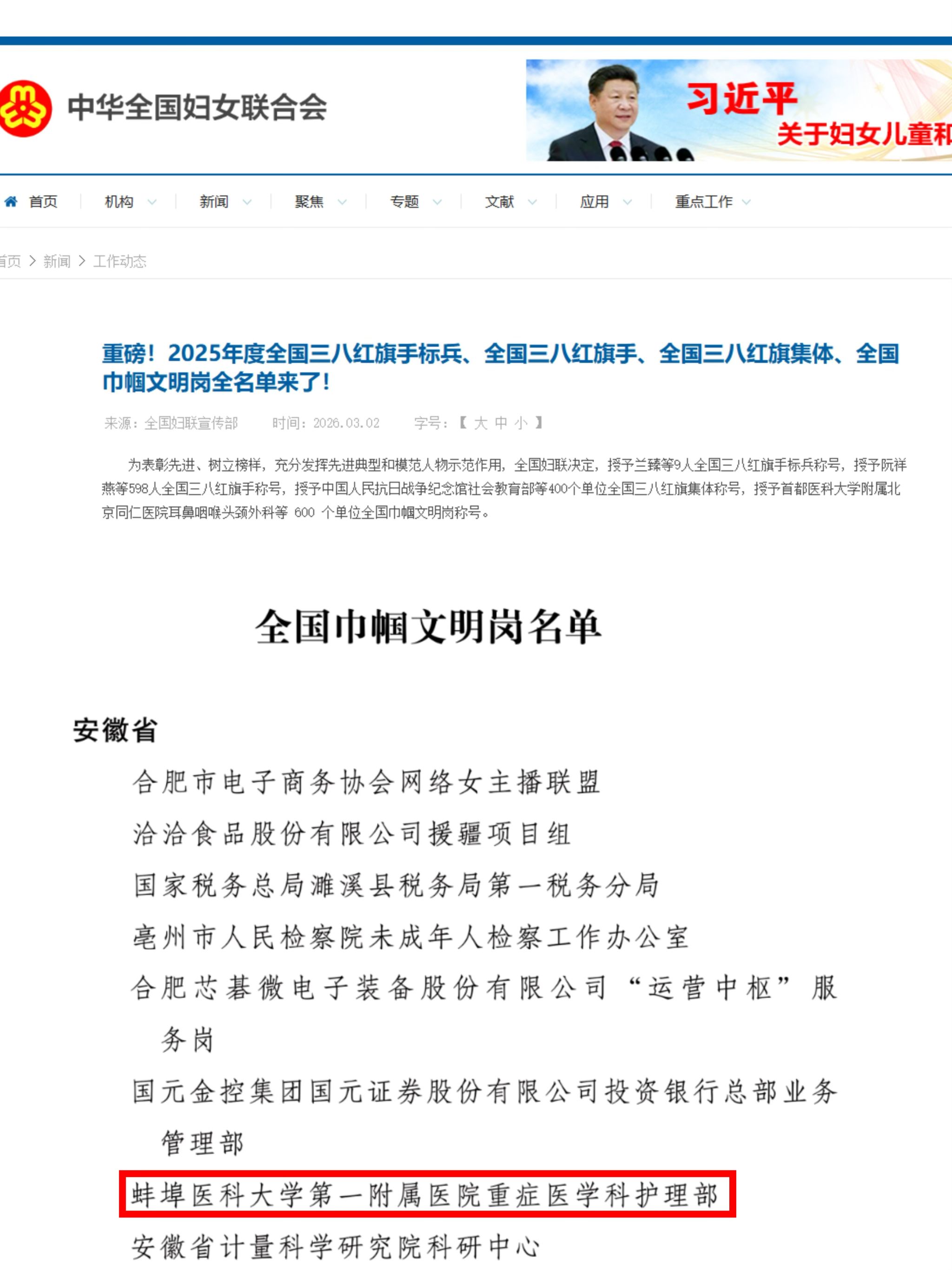 近日,全国妇联公布了2025年度全国三八红旗手标兵、全国三八红旗手、全国三八红旗集体、全国巾帼文明岗名单,我校第一附属医院重症医学科护理部凭借过硬专业素养、突出工作实绩,获评“全国巾帼文明岗”荣誉称号!这是学校在妇女工作和精神文明建设领域取得的重大突破,更是对全体女教职工辛勤耕耘、锐意进取的高度肯定。